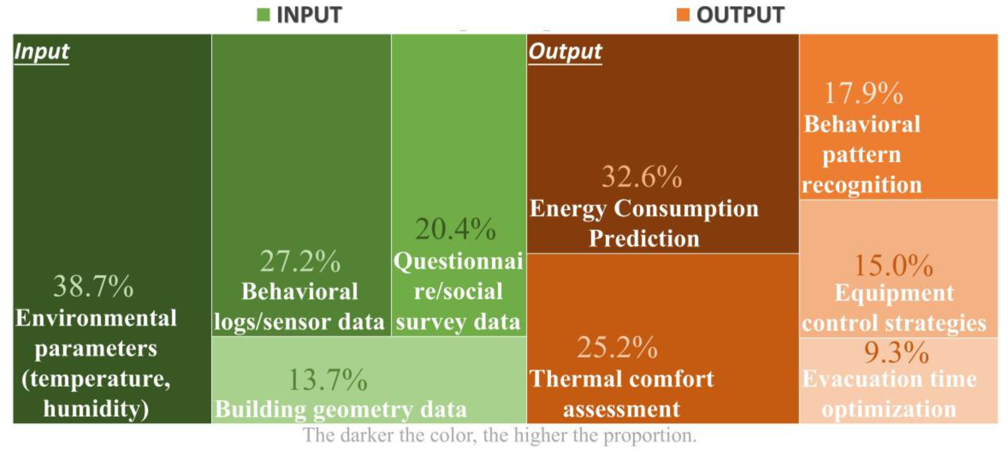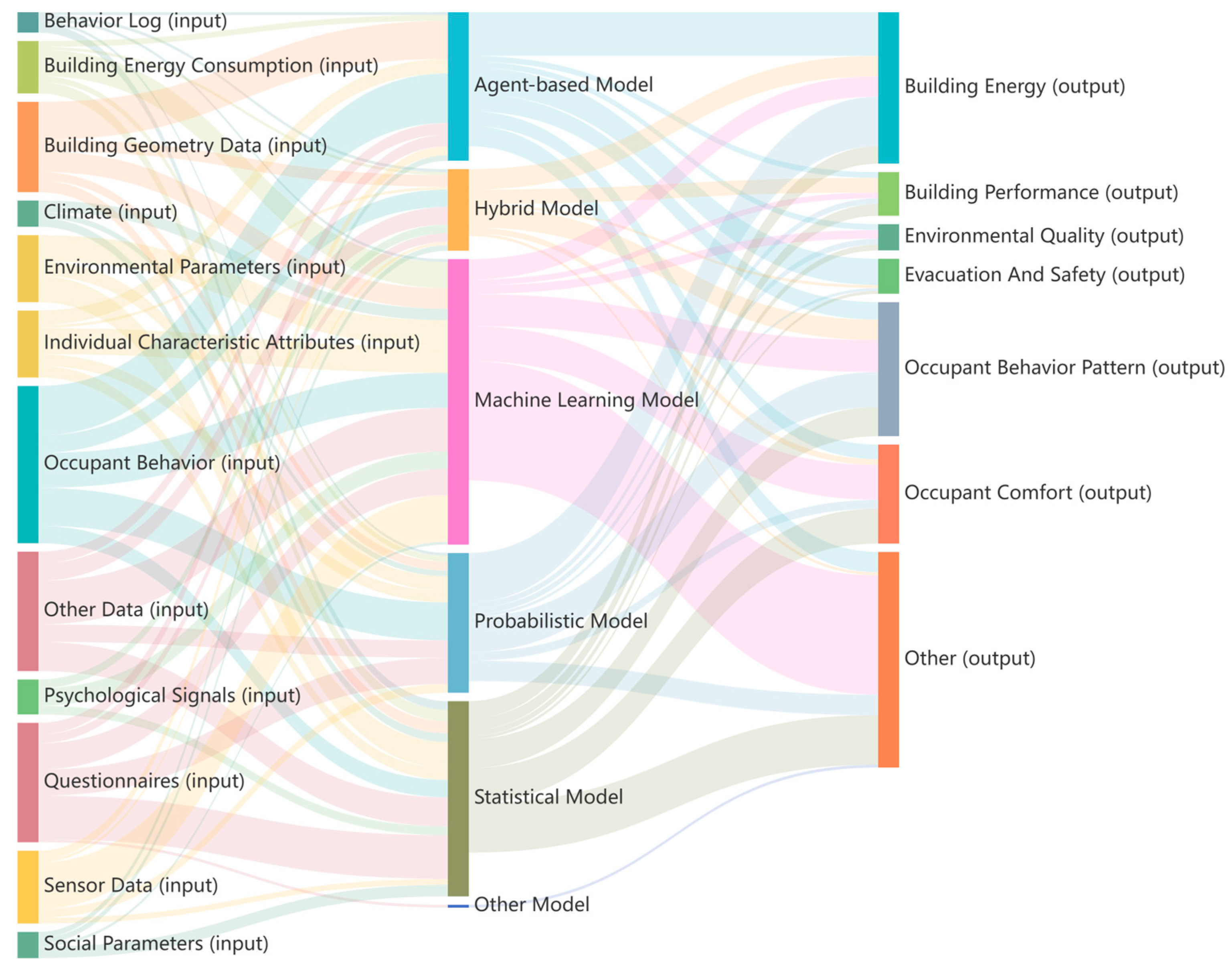 - The current occupantmodeling data framework exhibits significant imbalance: although input data increasingly originates from empirical sources—particularly occupant behavior and subjective data—output results remain highly dependent on simulation. Meanwhile, the adoption of parameters like psychosocial signals is minimal due to integration challenges. As a result, models risk reinforcing theoretical assumptions rather than capturing actual occupant variability. The application of physiological signals, immersive environments, and longitudinal datasets should be considered for the need for more comprehensive multimodal data strategies and standardized benchmarking protocols to balance empirical foundations with predictive complexity in occupant-centered modeling.