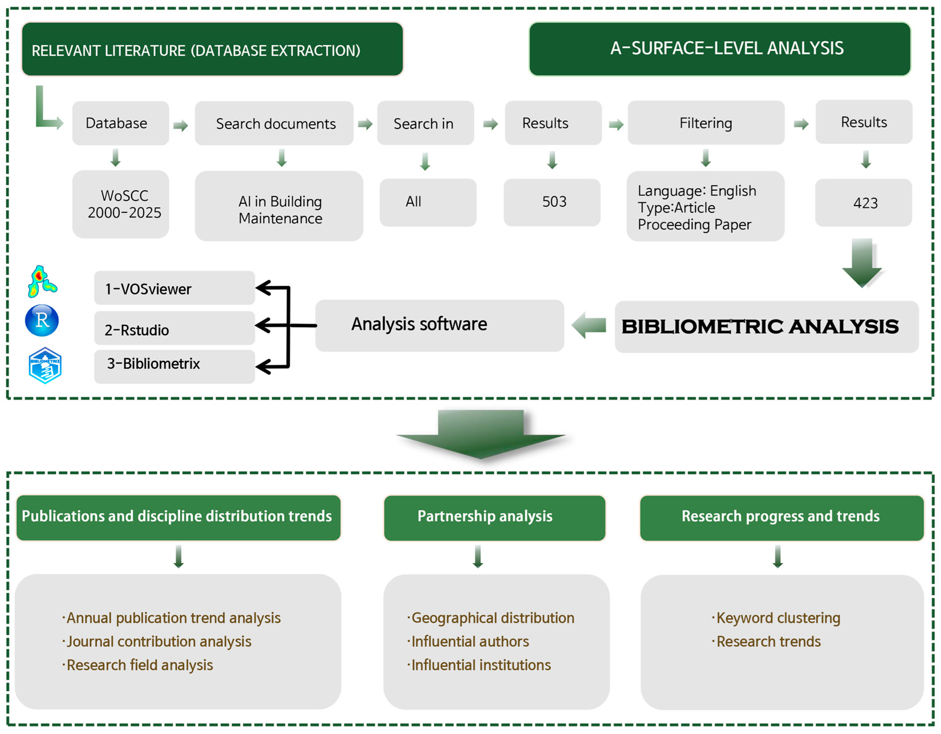 This study is based on 423 publications related to artificial intelligence and building maintenance, and conducts a systematic bibliometric analysis using Microsoft Office Excel 2021, ArcGIS 10.8.1, VOSviewer (v1.6.20), RStudio, and Bibliometrix v5.0.1 (R package). Specifically:
