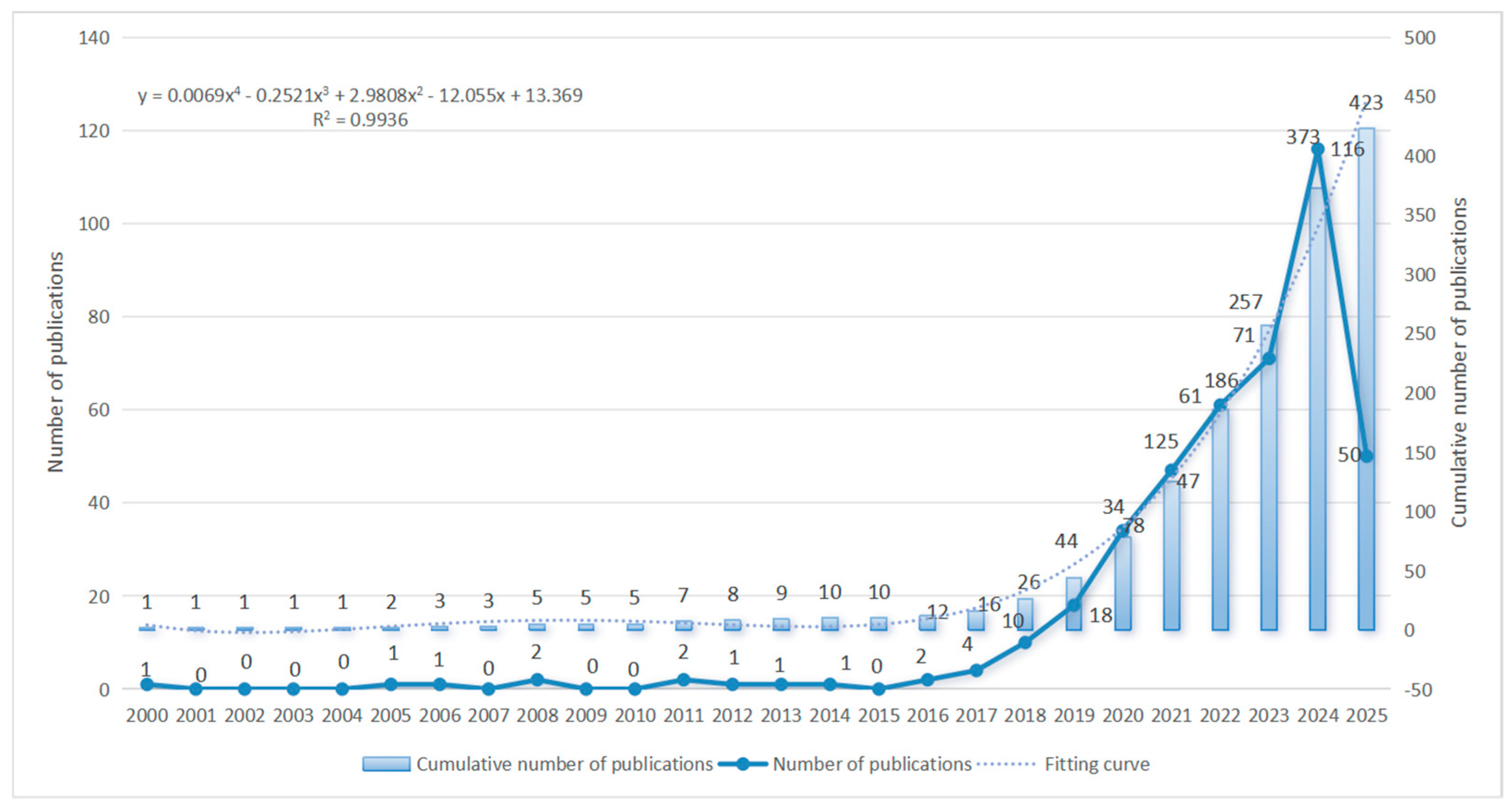 8]. However, the existing literature largely lacks systematic bibliometric and visualization studies that comprehensively examine the overall knowledge structure, thematic hotspots, and technological evolution of the field. As a result, no global and structured cognitive framework has yet been established, and it remains difficult to capture the latest developments in knowledge innovation and technological breakthroughs in a timely manner. To address this gap, this study adopts a bibliometric approach based on the Web of Science (WOS) Core Collection, selecting the relevant literature from the past 25 years concerning the application of artificial intelligence in building maintenance. The research systematically reviews the knowledge landscape, thematic hotspots, and developmental trajectory of the field. Using visualization tools such as ArcGIS 10.8.1 and VOSviewer (v1.6.20), we construct knowledge maps and research trend visualizations to comprehensively reveal the dynamic evolution of research hotspots and emerging frontiers. The specific objectives of this study are as follows: