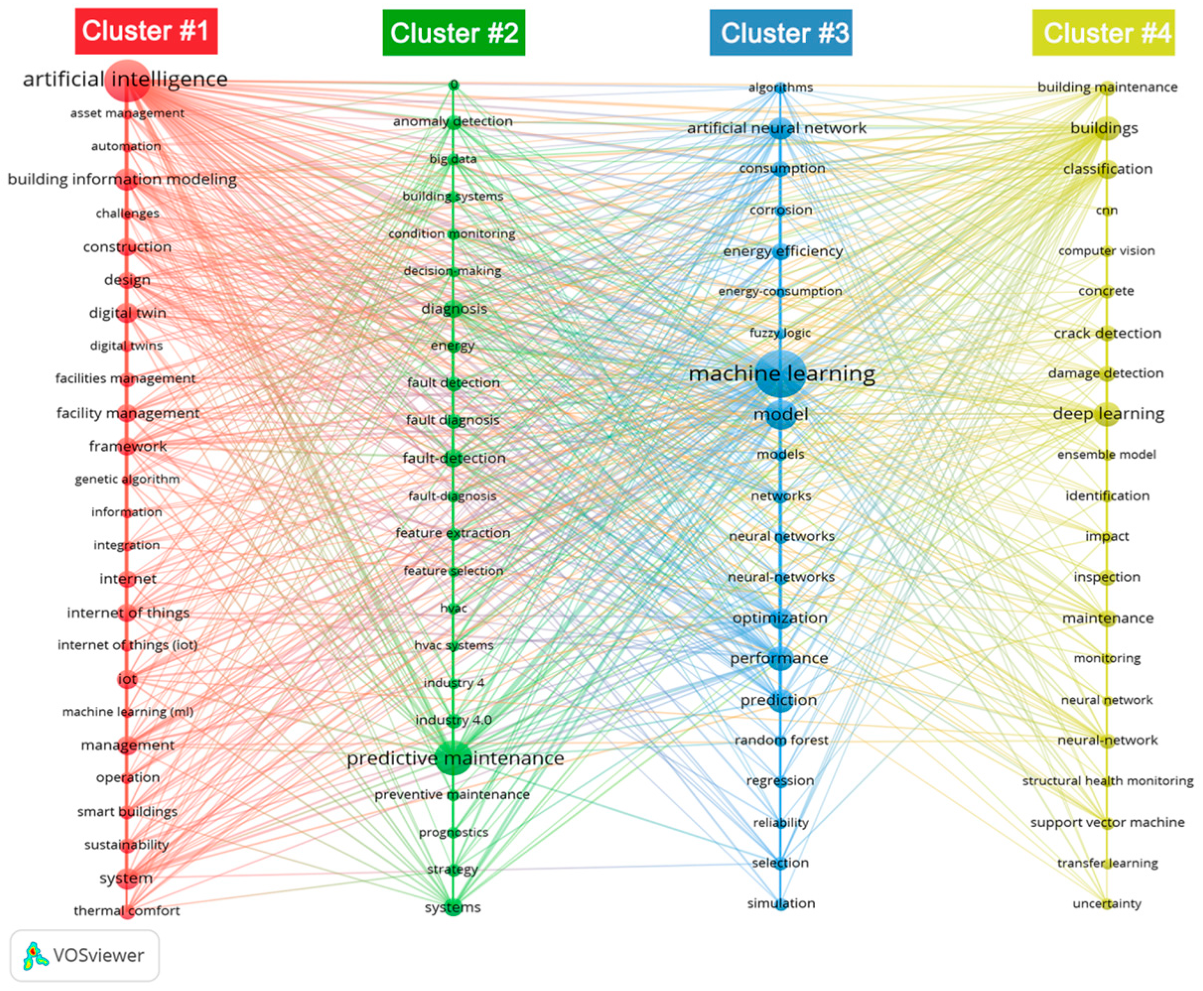 Together, the four clusters constitute the core knowledge structure of artificial intelligence in the field of building maintenance: Cluster 1 provides the data and platform foundation; Cluster 2 reflects the shift in maintenance logic toward intelligent prediction; Cluster 3 offers algorithmic support; and Cluster 4 drives practical application and deployment. The overall research evolution follows the trajectory of digital integration → intelligent sensing → algorithmic empowerment → automated operation and maintenance. The general trend indicates that the field is transitioning from tool development toward a new stage of systematic, sustainable, and autonomous intelligent maintenance. Future research should further strengthen integration across clusters, build an open and shared data ecosystem, and establish interpretable intelligent decision-making systems to enable adaptive management across the full life cycle of buildings.