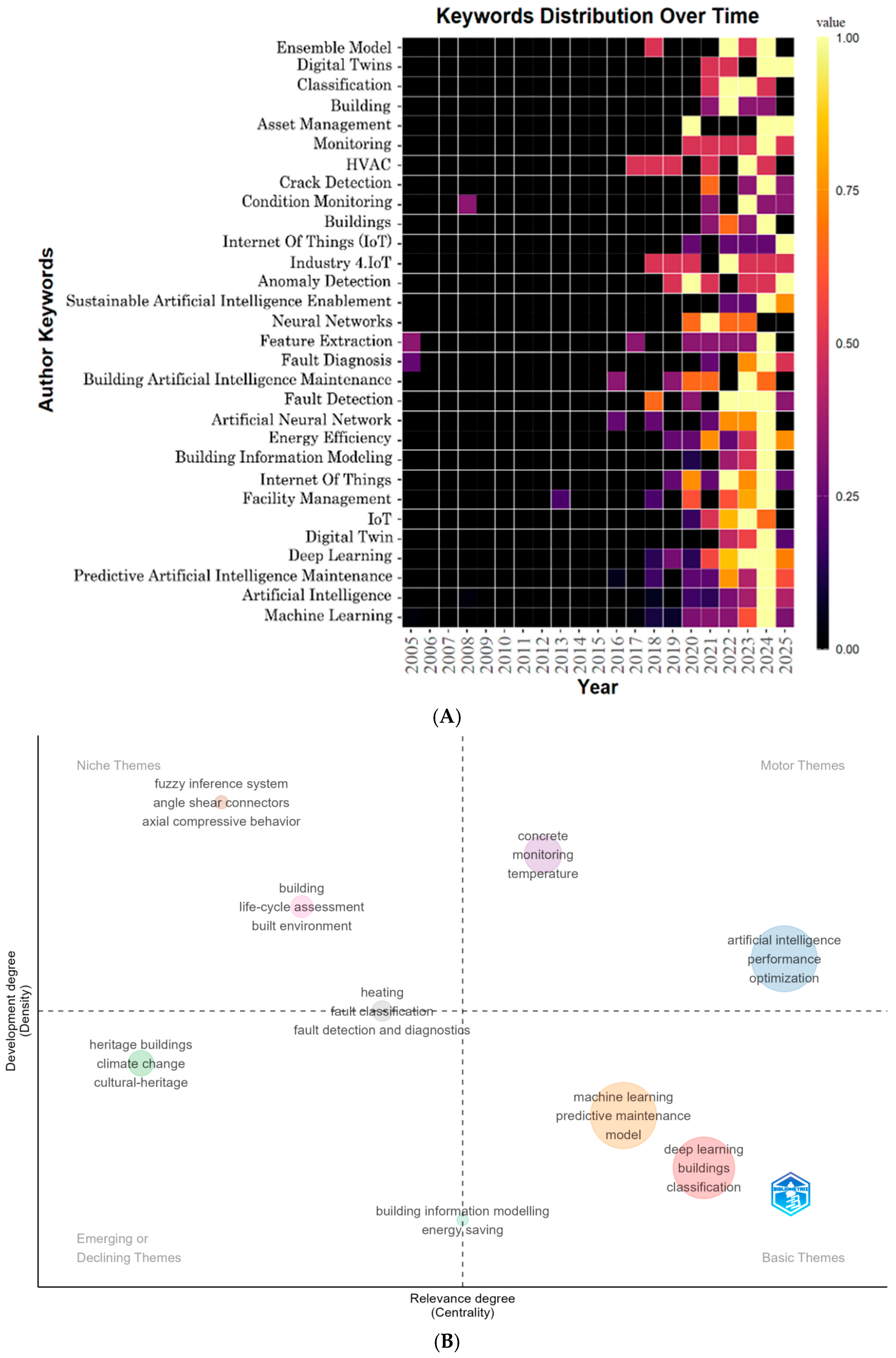 Figure 9A, the temporal visualization of keywords clearly reveals the dynamic evolutionary trajectory of research themes in this field. Between 2005 and 2015, related studies primarily focused on foundational themes such as “Fault Diagnosis” and “Feature Extraction.” During this period, keywords appeared infrequently and were dispersed, indicating that the penetration of artificial intelligence technologies into building maintenance was still at an early stage. After 2016, with the introduction of emerging technologies such as machine learning and deep learning, both the variety and density of keywords gradually increased. In particular, keywords such as “Machine Learning,” “Artificial Intelligence,” and “Deep Learning” began to appear with high frequency after 2018, reflecting the consolidation of the technological foundation of the field and a gradual shift in research attention toward the practical application of intelligent algorithms. Moreover, compound keywords such as “Digital Twin,” “IoT,” and “Energy Efficiency” have risen significantly since 2020, demonstrating the advancement of building maintenance research from single-technology approaches toward multi-technology integration and system-level intelligence.