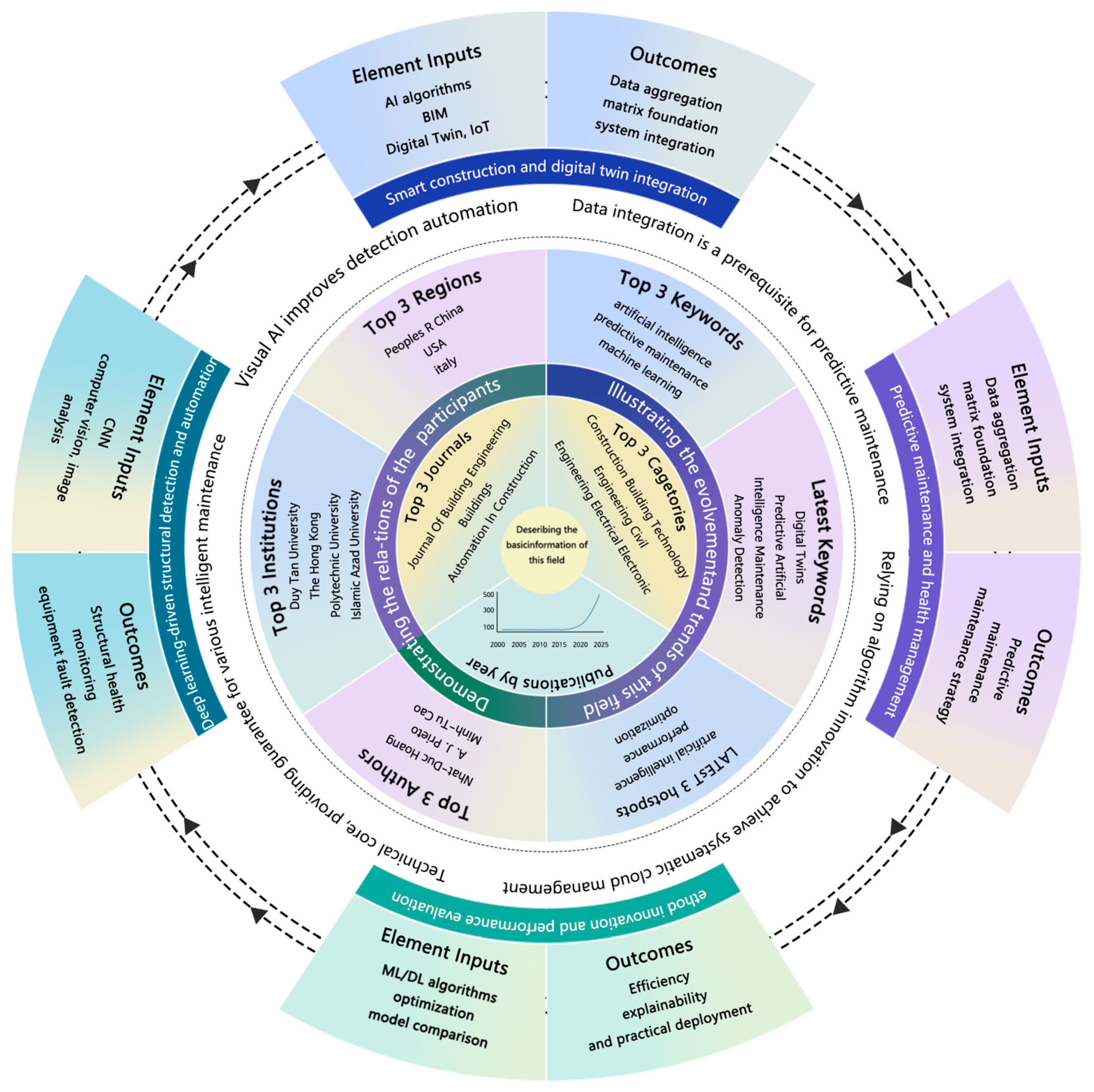 The outer ring displays the set of research keywords: the keyword co-occurrence patterns reveal the major research hotspots and evolutionary trends in the field, outlining the core themes and potential turning points across different periods. The analysis indicates that the thematic structure is primarily organized around four core clusters: “intelligent construction and digital twin integration,” “predictive maintenance and health management,” “algorithmic innovation and performance evaluation,” and “deep learning–driven structural inspection and automated operation and maintenance,” together forming the central lexical network of this research domain.