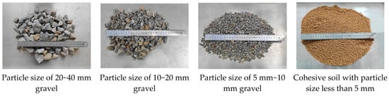 There is no universally accepted standard for the boundary particle size of the SRMs worldwide, with common values including 2 mm [,], 4.75 mm [,], 5.0 mm [,,,,], 9.5 mm [,], and 0.05 A1/2 (where A represents the area of the study area) [,]. Most existing studies utilize 5.0 mm as the boundary particle size. To ensure comparability with previous research, the boundary value for soil and stone particle size in this test was set at 5.0 mm. The particles with particle size less than 5.0 mm used cohesive soil, and the particles with particle size greater than 5.0 m used gravel.