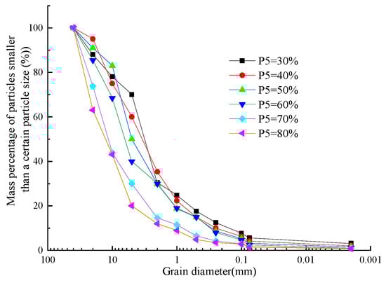 Six types of SRMs samples with various stone contents were prepared for the test, where the stone contents, denoted as P5, were 30%, 40%, 50%, 60%, 70%, and 80%, respectively. The curvature coefficient Cv for each sample was 2.0, while the non-uniformity coefficient Cu exceeded 5, indicating excellent gradation across all samples. The particle size grading curves for the samples with various stone contents are presented in Figure 3.