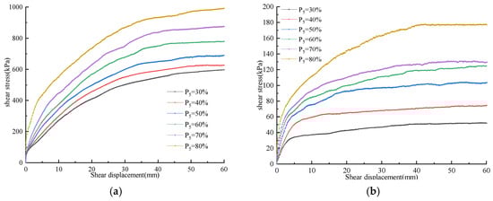 Curves of the shear stress versus shear displacement for SRMs under various normal stresses. (a) w = wop, P5 = 30%; (b) w = wop, P5 = 80%.