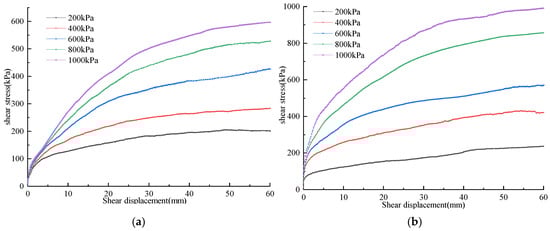 The relevant provisions on stopping the consolidation slow shear test of soil–rock mixtures in the References [,] are as follows: when the shear stress reading reaches stability or shows a significant decrease. If the shear stress reading continues to increase, the test cannot be stopped until the shear deformation reaches 1/5~1/10 of the sample diameter. The diameter of the test sample is 504.6 mm, and the maximum horizontal displacement of the instrument is 65 mm. Yang et al. [,] and Lei et al. [] also employed identical instrument for direct shear tests on soil–rock mixtures, and the maximum shear displacement they set was 60 mm. In order to compare with the existing research results, the maximum shear displacement of this test was also 60 mm.