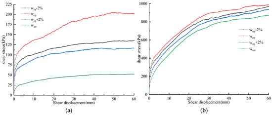 Curves of the shear stress versus shear displacement for SRMs with various water contents. (a) P5 = 30%, = 200 kPa; (b) P5 = 80%, = 1000 kPa.