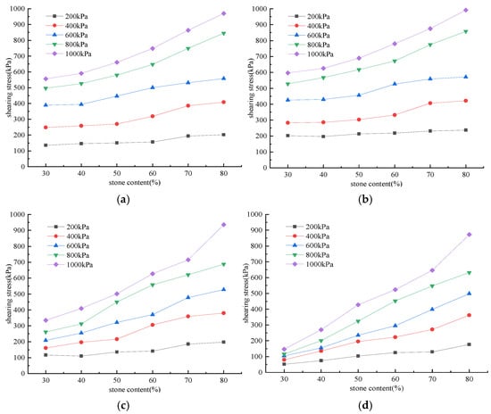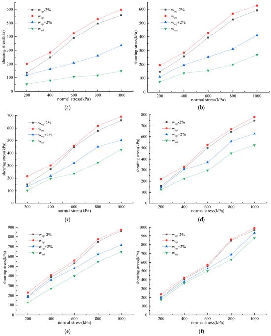 The results illustrated in Figure 9 indicate that the shear strength of SRMs with varying stone contents shows that it first increases, then decreases with rising water content. However, this trend was influenced by both normal stress levels and stone content. For all SRMs, when the water content fell below the optimal level, the shear strength exhibited a gradual increase in response to rising water content. As the water content reached its optimal level, the water content within SRMs was regarded as suitable. Consequently, both the compactness and shear strength reached the maximum. As water content increased, the water within SRMs gradually rose, although it did not reach complete saturation. Meanwhile, a portion of water existed as free water, which provided lubrication between particles. This reduction in friction and cohesion among the particles subsequently led to a diminished shear strength. Further increases in water content resulted in SRMs reaching saturation, with all voids fully filled with water. In this case, the lubrication effect of water became more pronounced, while the friction and cohesion between the particles were significantly reduced, and the SRM’s shear strength reached its minimum. For SRMs with water content at or below the optimal level, the relationship curves between shear stress and normal stress at identical stone content exhibit a consistent pattern.
