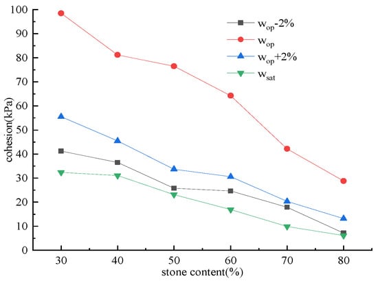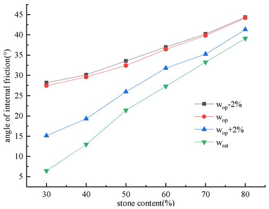 Figure 11 demonstrates that under varying water content conditions, the cohesion of SRMs declines with an increase in stone content. However, the rate of reduction varied across different water contents. When w = wop − 2%, the cohesion decreased with increasing stone content, and the rate of reduction increased with higher water content. When w = wop, the reduction in cohesion with increasing stone content occurred at the fastest rate. Conversely, when w > wop, the rate of reduction in cohesion associated with increased stone content gradually slowed down as water content increased. In case of w = wop − 2%, the cohesion decreased from 41.22 kPa at 30% rock content to 7.20 kPa at 80% rock content. In case of w = wop, the cohesion decreased from 98.53 kPa at 30% stone content to 28.79 kPa at 80% stone content. In case of w = wop + 2%, the cohesion decreased from 55.51 kPa at 30% stone content to 13.20 kPa at 80% stone content. In case of w = wsat, the cohesion decreased from 32.41 kPa at 30% stone content to 6.12 kPa at 80% stone content. This phenomenon can be attributed to the dominant influence of cohesive soil containing fine particles on the cohesion in SRMs, while coarse particles do not contribute to increasing cohesion. As stone content increased, the fine particle proportion in SRMs decreased, while more coarse particles disrupted the continuous structure of the finer ones. Consequently, higher stone content resulted in a reduced effective contact area between fine particles, thereby diminishing cohesion among them.