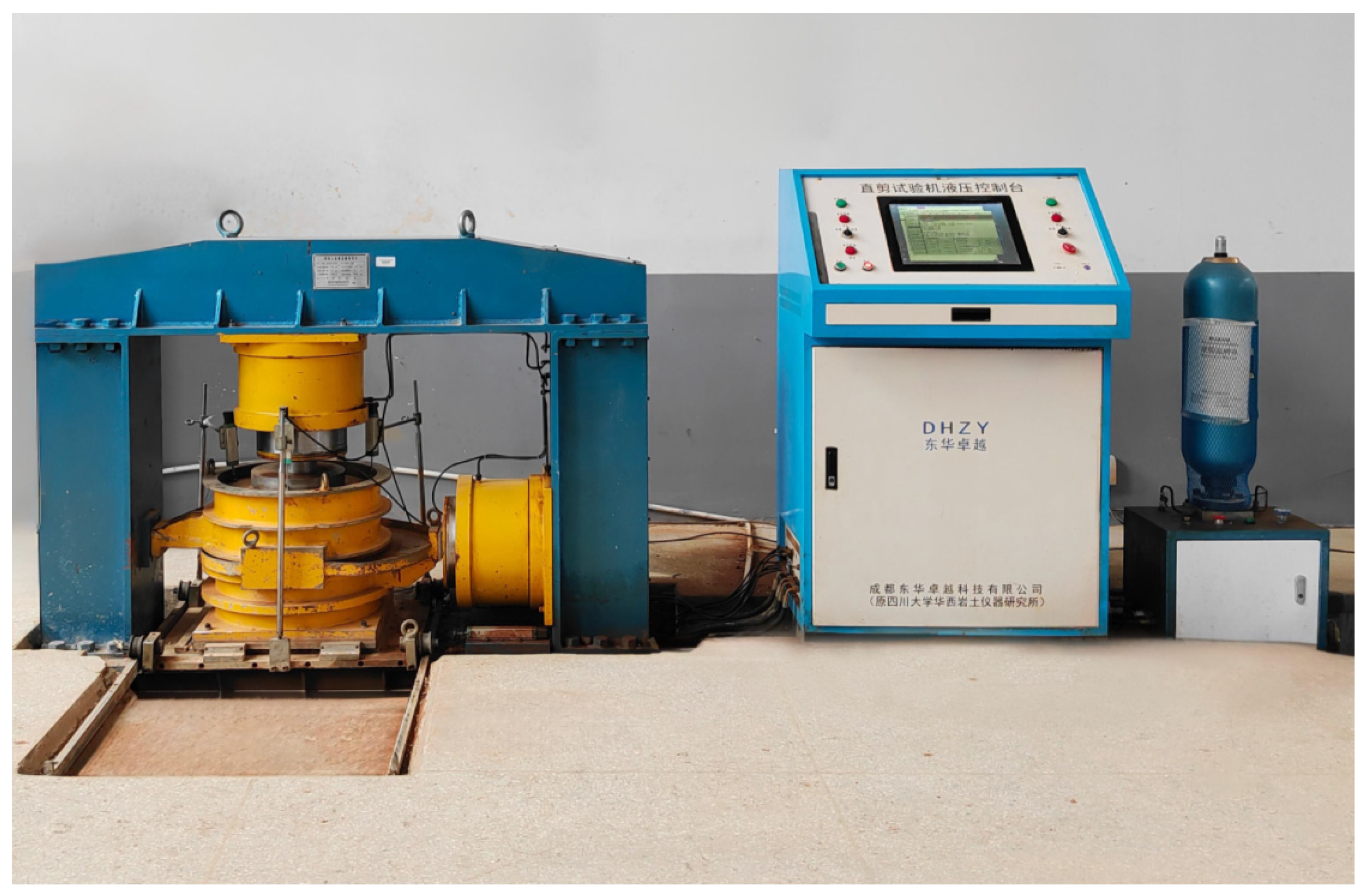 - Xu, X.; Wei, H.; Meng, Q.; Wei, C.; Ai, D. Effects of shear rate on shear strength and deformation characteristics of coarse-grained soils in large-scale direct shear tests. Chin. J. Geotech. Eng. 2013, 35, 728–733. [Google Scholar]