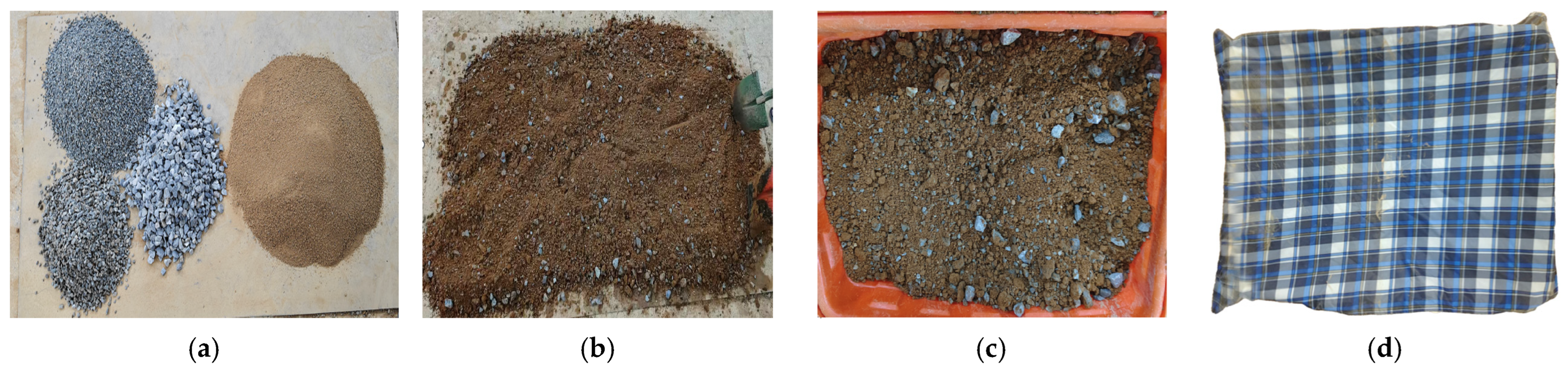- Kong, X.; Wang, J.; Liu, X. Experiment and Research on Vibrating Compaction Properties of Soil-aggregate Mixture. Chin. J. Undergr. Space Eng. 2007, 1, 55–61. [Google Scholar] [CrossRef]