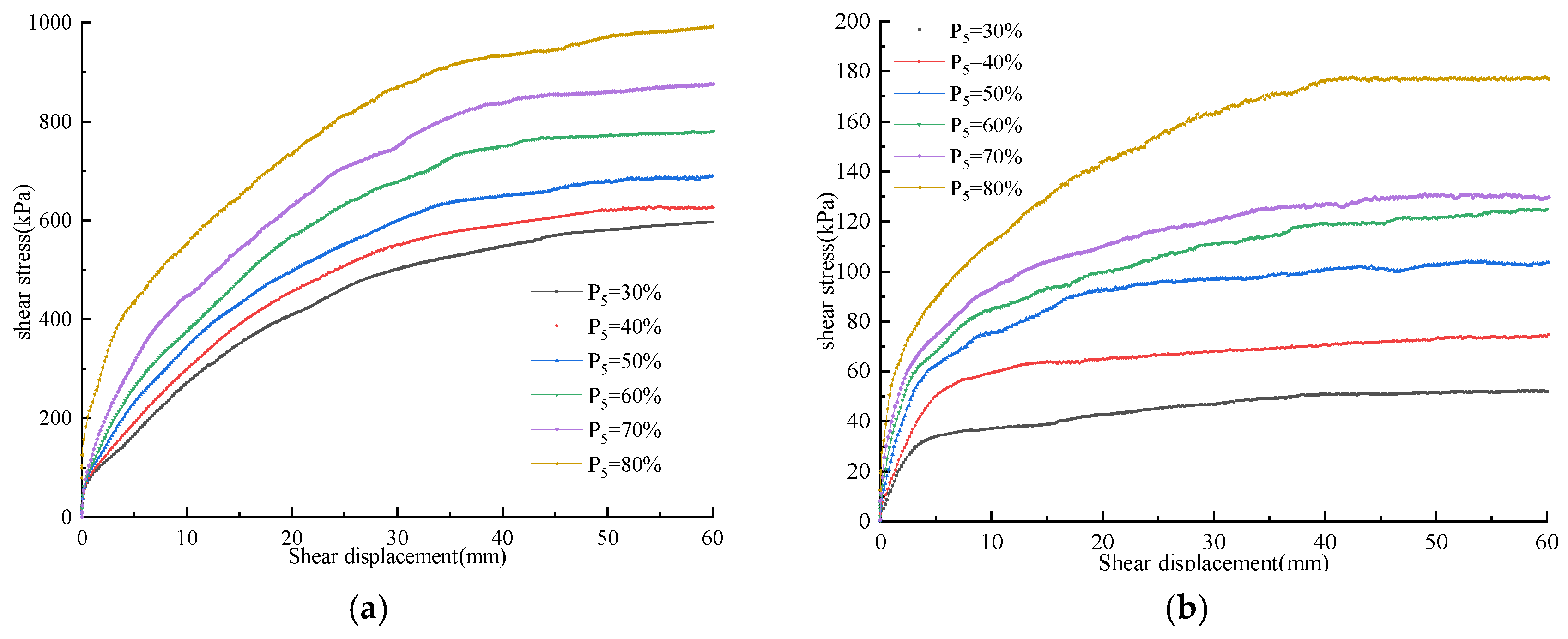 3.1. Shear Stress–Shear Displacement Curves of SRMs