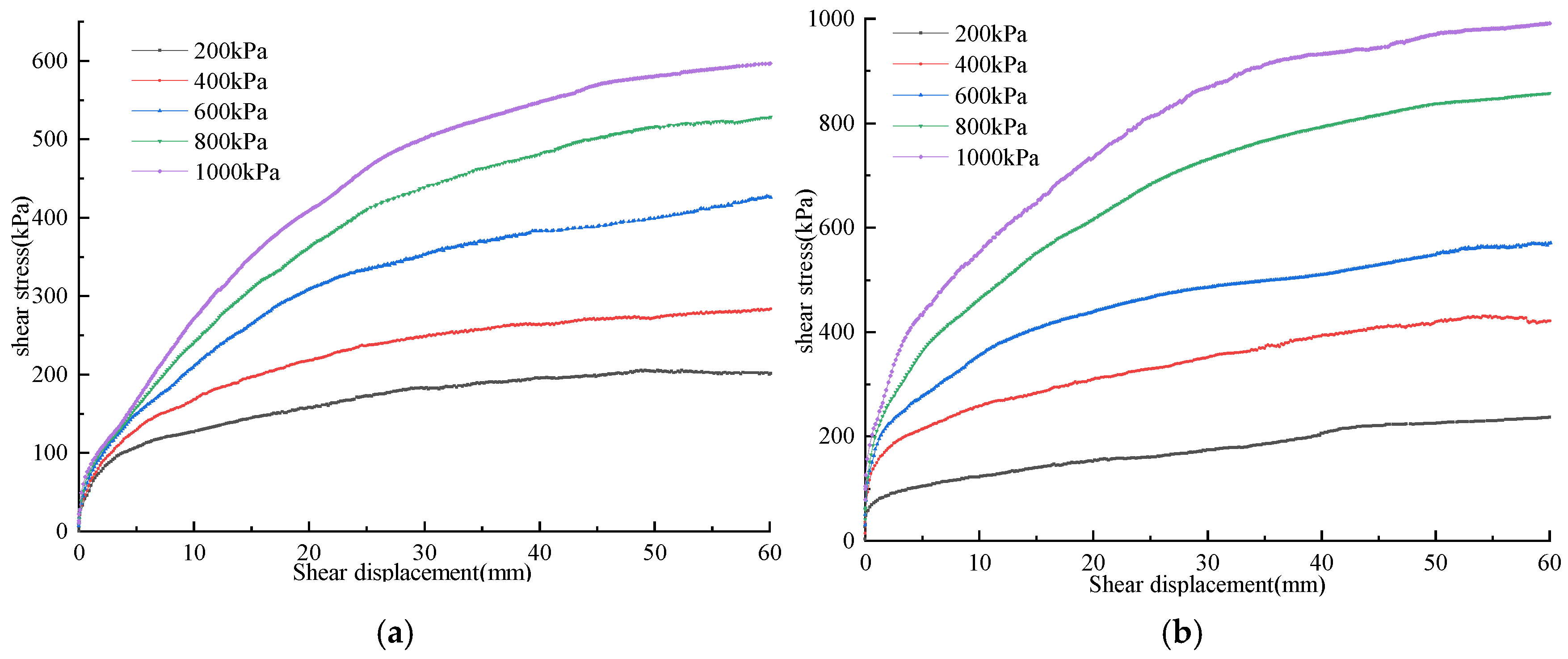 3.1.3. Impact of Normal Stress on the Shear Stress–Shear Displacement Curve
