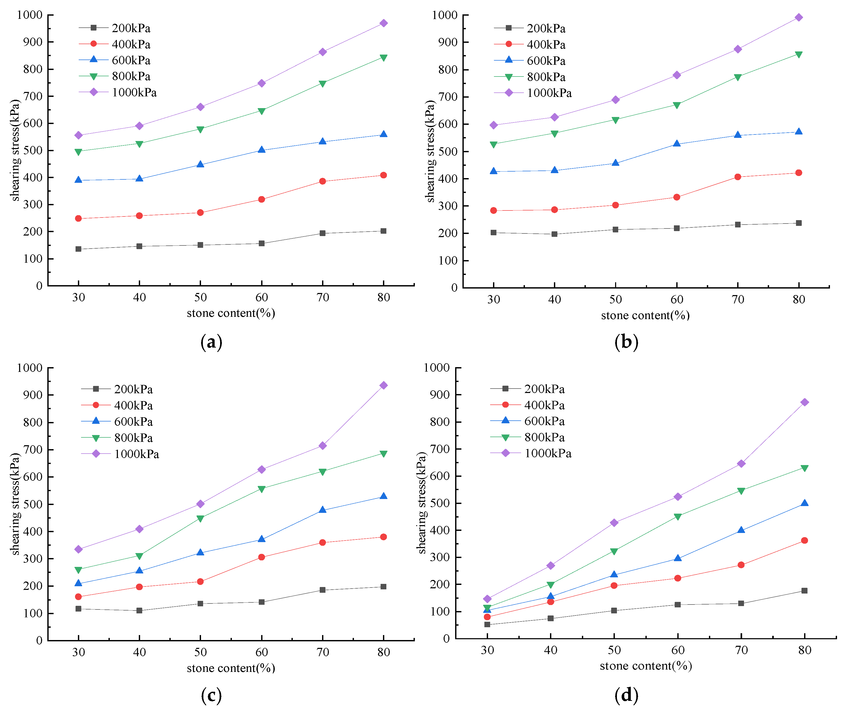 - The SRM’s shear strength increased with higher stone content under various conditions. At low normal stress levels, the shear strength displayed a gradual improvement with an increase in stone content. However, as normal stress increased, the rate and amplitude of shear strength exhibited a significant rise as stone content was elevated. The shear strength of the SRMs initially increased and subsequently decreased as the water content increased across different stone content levels. The shear strength peaked at optimal water content. The shear strength of SRMs characterized with higher stone content exhibited reduced sensitivity to variations in water content. The SRM’s shear strength aligned with the Mohr–Coulomb criterion.
