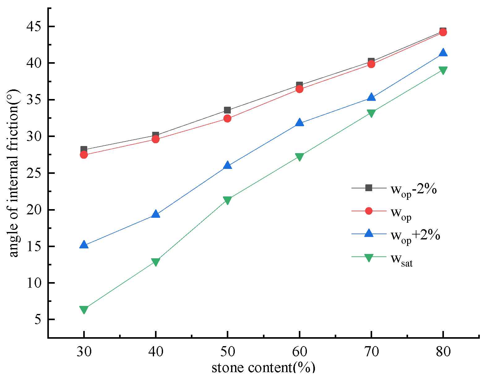 3.3. Impact of Water Content and Stone Content on Internal Friction Angle of SRMs