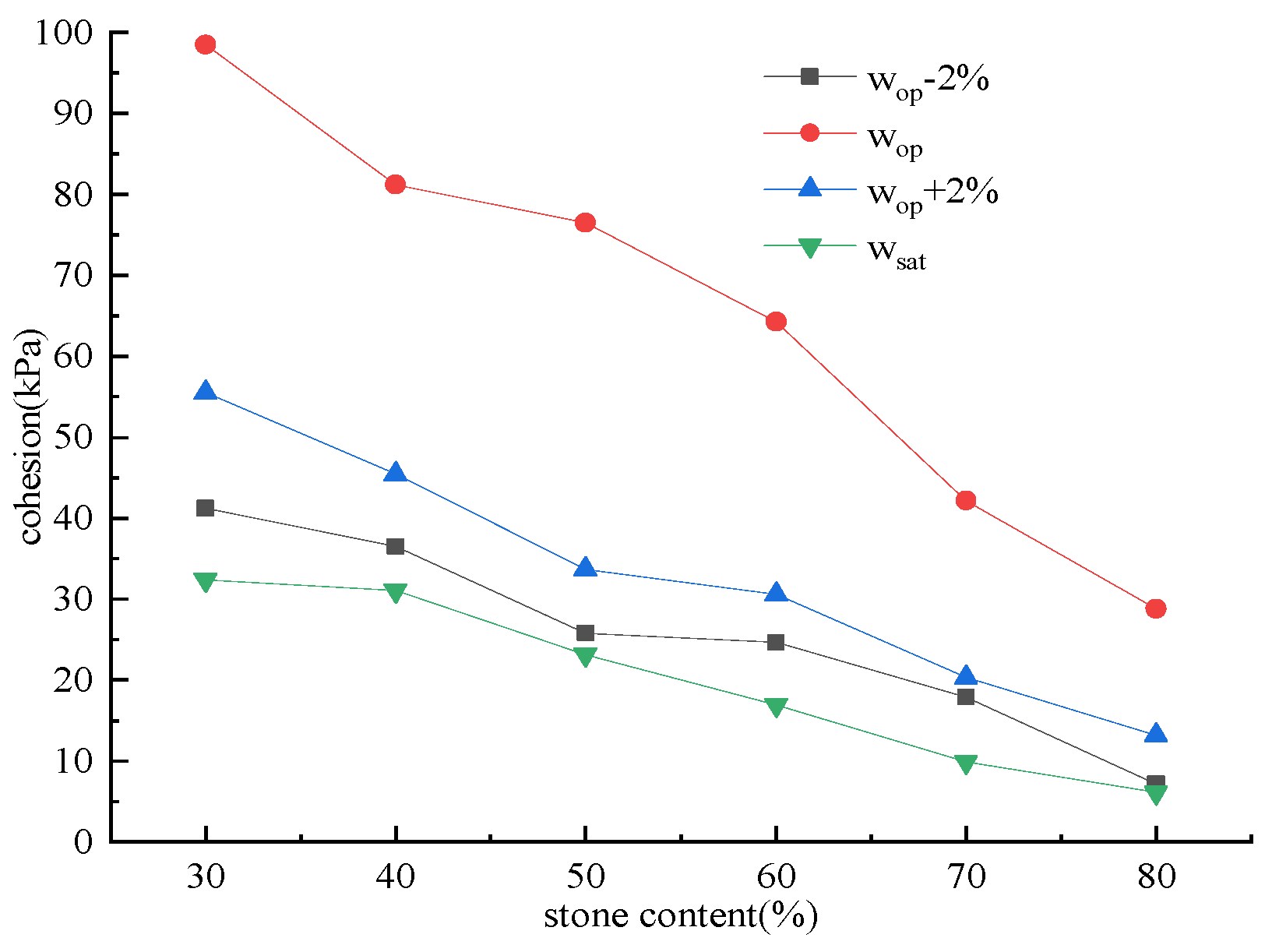 - The cohesion of the SRMs decreased as the stone content increased, regardless of the water content conditions. The initial rise was succeeded by a drop as the water content grew, with the greatest decrease happening at the optimal water level. The cohesion of the SRMs containing low stone content was notably affected by the water content.