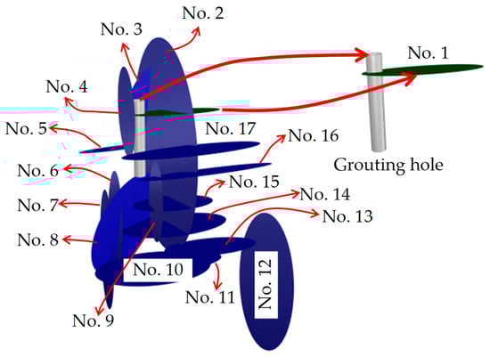 The quality of grouting construction largely depends on rock fractures, particularly whether fractures capable of forming leakage pathways can be adequately filled and sealed by cement grout [,]. The aforementioned research used fracture or geological parameters as important input parameters for the prediction of cement intake, which provides the references for this study. Seepage through rock foundations typically occurs through networks of conductive fractures []. Nevertheless, many analyses emphasize only those fractures that intersect the grouting hole directly, while neglecting fractures that connect indirectly through intermediate branches. This overlooks the broader implications of fracture connectivity for hydraulic behavior. In routine design, only fractures that directly cut a hole are considered; at our site, this would reduce Figure 1 to “Fracture No. 1”. Specifically, Fracture No. 2 intersects with Fracture No. 1 and acts as a critical “bridge,” linking fractures No. 3 through 17 via direct or intermediate connections that control storage and leakage. We therefore frame cement intake prediction as a problem of reachable connectivity, not simply of local intersections.