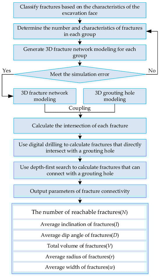 In this study, the development of a 3D model that encapsulates the interplay between fractures and grouting holes was undertaken to ascertain fracture parameters conducive to connectivity with a grouting hole, thereby facilitating a quantitative delineation of fracture connectivity. As depicted in Figure 3, the methodology for ascertaining 3D fracture connectivity is structured into three sequential steps: the construction of a coupled 3D model, the identification of fractures with the potential to interface with a grouting hole, and the computation of connectivity parameters.