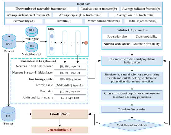 A GA is an intelligent optimization technique that emulates the principles of natural selection and genetic inheritance as posited by Darwin’s theory of biological evolution. It is adept at navigating the search for global optima by mimicking the evolutionary processes found in nature []. Within a GA, the gene represents the fundamental unit, with a collection of genes constituting a chromosome. Each chromosome is associated with an objective function, which enables the ranking of chromosomes based on their performance metrics. Through processes of crossover and mutation, followed by iterative optimization, the algorithm converges towards the optimal parameter values. Since its inception, the GA has been widely applied across a spectrum of multi-objective optimization challenges, owing to its minimal parameter requirements and robust global search capabilities []. In light of these attributes, this study integrates a GA with a DBN, devising a novel GA-DBN approach to predicting cement intake. In a GA-DBN, the GA is employed to optimize the hyperparameters of the DBN, ensuring that the network converges to an optimal solution. The optimization process begins by initializing a population of candidate solutions (chromosomes), each representing a set of DBN hyperparameters, such as the number of hidden layers, the number of neurons in each layer, the learning rates, and the momentum values. The fitness of each solution is evaluated based on a fitness function; the individuals with higher fitness are selected for reproduction, undergoing crossover and mutation operations to create new individuals. This process is repeated for several generations, with the population converging towards an optimal set of hyperparameters. The GA-DBN method encapsulates a synergistic fusion of evolutionary computation and deep learning, offering a robust framework for addressing complex predictive modeling tasks in the domain of geotechnical engineering and beyond.