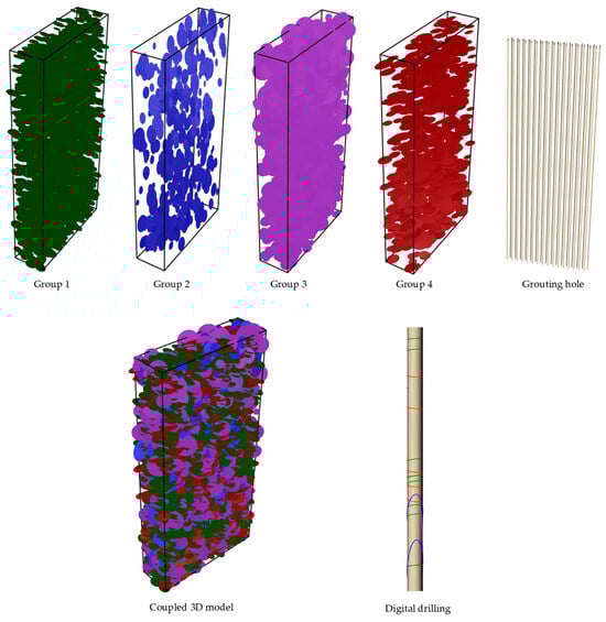 Leveraging the design parameters, the spatial coordinates and dimensions of the grouting holes were ascertained, culminating in the formulation of a 3D model of the grouting holes. Concurrently, as per the methodology outlined in Section 2.1.1, a 3D fracture network model was instantiated. Two models—the grouting hole model and the fracture model—were integrated within a common spatial framework, culminating in a cohesive coupled model.