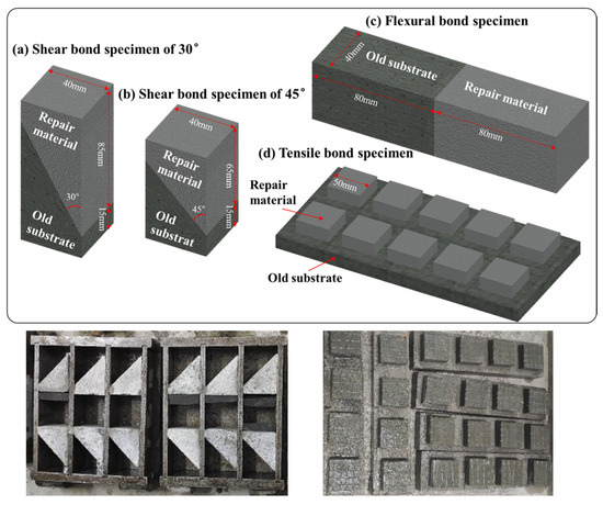 The schematic and physical image of the bonded specimen are shown in Figure 1. Before the specimen was prepared, the surface of the repaired substrates needed to be rough and cleaned to ensure that the bonding surface of all the repaired substrates had basically the same surface roughness. For the mortar substrates used for the shear bond tests, the samples were demolded after 1 d, and then the bonding surface was polished with 80 mesh sandpaper. When the cement paste on the bonding surface was removed and the sand particles were exposed, the grinding was stopped. Subsequently, the repair mortar substrates were cured to 90 d, and a brush was used to remove the precipitated materials attached to the bonding surface before the test. For the concrete substrates used for the tensile bond tests, before the final setting of the concrete (approximately 5 h), the bonding surface of the concrete slab was roughened using a steel wire brush in both horizontal and vertical directions. After demolding, grooves with a depth of approximately 1 mm were cut in the concrete slab along the edge of the specimen after demolding to avoid the influence of the surrounding matrix on the bond strength. The specimens were then cured, and the sediment attached to the bonding surface was removed using a brush before testing.