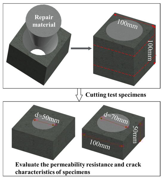 The truncated-cone-bonded specimen was used to test the bonding properties of the repair system under the constraint of the substrate and the effect of interface cracks on the permeability [39]. The bevel design of the truncated cone is more conducive to macroscopically reflecting the compression effect of the repair materials on the substrates when the repair materials expand, so that the repair materials are in closer direct contact with the substrates. Firstly, the hollow concrete matrix was prefabricated using an acrylic mold, and then the cement paste on the inner wall of the matrix was polished with sandpaper to ensure that the bonding surface of each specimen had the same roughness. After pouring the repair material, the specimens were cured for 90 d under standard curing conditions (20 ± 2 °C, RH ≥ 95%) and dry conditions (20 ± 2 °C, RH = 60 ± 5%), respectively. Then, the specimens were cut to a height of 50 mm to test the impermeability of the repair system and observe the crack width at the repair interface. The schematic diagram of the preparation of the truncated-cone-bonded specimen is displayed in Figure 2.