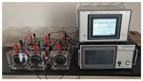 After the specimens were cured to 28 d, the electric flux of the specimens was tested based on the standard GB/T 50082-2024 [46]. The average value of 3 samples in each group was taken as the final electric flux. The electric flux test device is displayed in Figure 3.