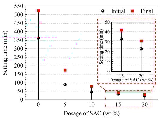 The influence of SAC on the setting time of OPC-GGBS-SAC composite system is exhibited in Figure 4. With the addition of SAC, the initial and final setting times of the OPC-GGBS-SAC composite system were greatly shortened, and the interval between the initial setting time and the final setting time was also greatly reduced. The initial setting time and final setting time of OPC-GGBS were 362 min and 523 min, respectively. After adding 5%, 10%, 15%, and 20% SAC, the initial setting times were shortened to 89 min, 45 min, 33 min, and 23 min, respectively, and the final setting times were shortened to 174 min, 80 min, 42 min, and 31 min, respectively. Even if a small amount of SAC was added, it was found to significantly promote setting and early strength. This is because SAC can rapidly hydrate and generate a large amount of AFt after contact with water, thereby quickly forming a network structure in the cement paste and promoting the increase in viscosity of the paste, causing the cement paste to lose its plasticity and develop its strength. When the amount of gypsum carried by SAC was insufficient, it will still react with the gypsum carried by the OPC, thus accelerating the time in which the OPC starts the reaction.