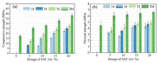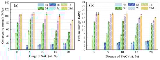 The mechanical performance of OPC-GGBS-SAC mortar under standard curing conditions is illustrated in Figure 5. When the SAC content exceeded 5%, the composite system hardened and had strength within 8 h. When the content exceeded 10%, the composite system began to have strength within 4 h. At 4 h and 8 h, with the increase in SAC content, the compressive strength and flexural strengths of OPC-GGBS-SAC system continued to increase. At 1 d, 3 d, 7 d, and 28 d, with the increase in SAC dosage, the compressive strength and flexural strength of the OPC-GGBS-SAC composite system showed a trend of first increase followed by decrease. Among them, when the SAC content was between 5% and 10%, the compressive and flexural strength reached the maximum at 1 d. When the SAC content was 5%, the compressive strength of 3 d, 7 d, and 28 d was highest. When the SAC content was 10%, the flexural strength reached the maximum at 28 d. For the mechanical properties before 1 d, the higher the amount of SAC, the higher the strength. For the mechanical properties of 1 d to 28 d, the optimal content of SAC was maintained between 5% and 10%.