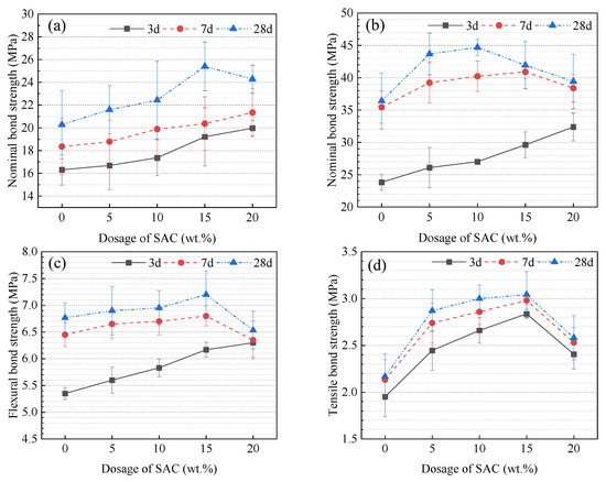 Figure 7c,d reflect the bonding ability of the bonding interface under flexural failure and tensile failure. These two forms of force actually reflect the strength of van der Waals force, mechanical meshing force and chemical bonding force at the bonding interface. For the bonding interface of cement-based materials, mechanical meshing force plays a major role. According to the data of flexural bonding, with increasing SAC content, the bonding strength of 3 d gradually increased, while the bonding strength of 7 d and 28 d reached the highest when the SAC content was 15%. For the tensile bonding specimens, the bonding strength of 3 d, 7 d, and 28 d also reached the highest when the SAC content was 15%. When the SAC content increased to 20%, the tensile bond strength of each age decreased significantly. Based on the results of different stress forms, when the SAC content was 10~15%, the improvement in the bonding strength of the composite material is optimal. Compared with the blank group, under four different stress forms, the growth rates of 28 d bond strength were 10.6%, 22.7%, 2.8%, and 38.9%, respectively, when the SAC content was 10%, and the growth rates of 28 d bond strength were 25.2%, 15.2%, 6.5%, and 40.7%, respectively, when the SAC content was 15%.