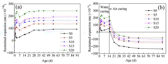 Figure 8 shows the restrained expansion rate of OPC-GGBS-SAC mortar cured in water and air. In Figure 8a, after the specimens containing SAC were placed in water for curing, the expansion phenomenon occurred in the first 3 d, followed by a brief shrinkage. After 7 d, it continued to expand and gradually stabilized at 28 d of curing. The early expansion of OPC-GGBS-SAC composite system was mainly attributed to the expansion effect of a large amount of AFt generated by SAC hydration. On the other hand, the ‘wet expansion’ of the specimen occurred after water absorption. The expansion of the specimen without SAC ended after 1 d, and then the volume shrank under the action of chemical shrinkage. The early expansion duration and expansion amount of the specimens without SAC were lower than those with SAC. In fact, in the process of curing the whole specimen in water, the shrinkage caused by the hydration of the specimen itself, the expansion of the hydration products and the “wet expansion” of water absorption occurred simultaneously. With the increase in SAC content, the expansion rate of mortar specimens increased significantly before 3 d, and with the increase in curing age, the expansion rate also improved slightly. It demonstrates that the hydration expansion of SAC mainly occurred in the early stage and can well compensate for the early shrinkage of the composite system. Due to the expansion of all mortar samples during 3 d~28 d was basically the same, the expansion amount generated during this period was considered to be as the hydration reaction in the system progresses. The specimen underwent ‘wet expansion’ due to continuous water absorption and the newly generated hydration products squeezed the pore wall in the pore’s water-filled state. Compared with the samples without SAC, after adding 5%, 10%, 15%, and 20% SAC, the restrained expansion rate of mortar specimens at 90 d increased by 46.1%, 76.9%, 107.7%, and 161.5%, respectively.