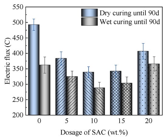 In order to evaluate the impact of SAC on the chloride ion permeability resistance of the repair system formed by the repair materials and the damaged substrate, the truncated-cone-bonded specimens were prepared according to the steps outlined in Figure 2. The samples were subjected to dry curing and wet curing for 90 d, and the electric flux was tested. The results are presented in Figure 9. The electric flux of the dry-cured specimen was higher than that of the wet-cured specimen. This is because in a long-term drying environment, some cracks and defects may be produced at the adhesive interface between the repair materials and the cone substrate due to shrinkage. During the wet curing process, the unhydrated cement particles and GGBS in the repair material continued to undergo hydration reaction, which promoted higher density in both the repair material itself and the bonding interface. As the SAC content increases, the electric flux of the truncated-cone-bonded specimens under different curing conditions decreased first and then increased. When the SAC content was 10%, the electric flux of the cone-bonded specimen was the lowest. Compared with the blank group, the electric flux values of the specimens under dry curing and wet curing were reduced by 31.2% and 20.4%, respectively. This indicates that the resistance to chloride ion penetration of the bonding interface was promoted by the addition of SAC.
