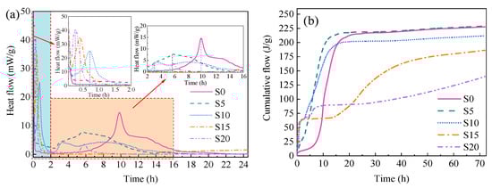 Effect of SAC on hydration heat of OPC-GGBS-SAC: (a) heat flow; (b) cumulative heat.
