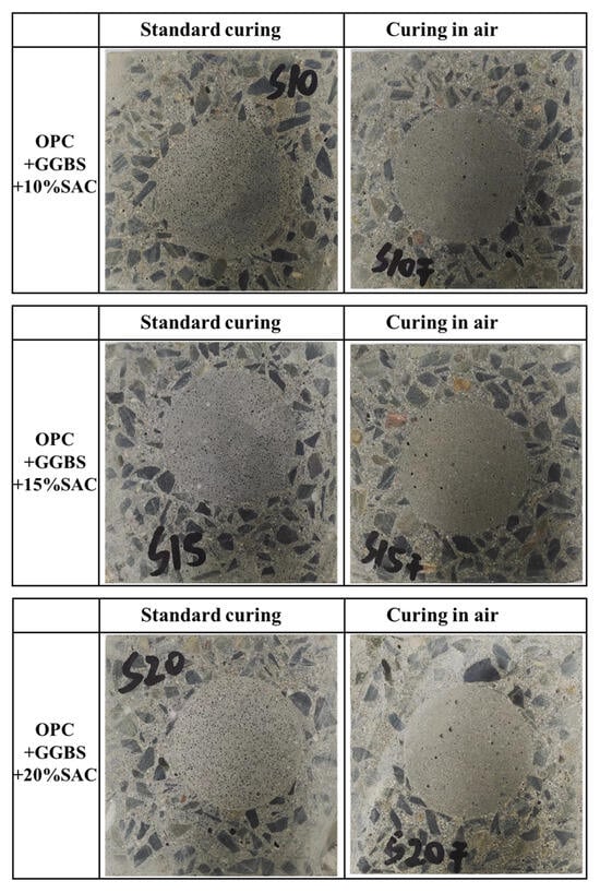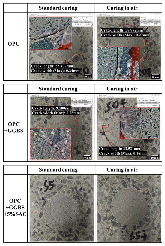 After standard curing and air curing for 90 d, the cracking at the bond interfaces were observed via the macro imaging equipment of the crack width tester. Figure 11 shows the reliability verification of the bonding interface of different repair systems. No cracks were found at the interface of the truncated-cone-bonded specimens with SAC, indicating that the bonding reliability was better. However, both OPC and OPC-GGBS specimens exhibited interface cracking under standard curing and air curing. In contrast, the crack width of the OPC-GGBS composite system was smaller than that of the pure OPC specimen, which indicates that the crack width of the bonding interface can be reduced to a certain extent by GGBS. In addition, even under standard curing, both OPC and OPC-GGBS also appeared cracking phenomenon. This indicates that the drying effect of the environment was not the only factor causing interface cracking, and the reason for cracking was more likely to be caused by the early shrinkage of the repair material. Therefore, it is particularly important to compensate for the early shrinkage of the repair material, and the addition of SAC just makes up for this defect. From the data of the restrained expansion rate, compared with the OPC-GGBS composite system, even if 5% SAC was added, the restrained expansion rate of the specimen increased from 60.7 × 10−6 to 110.7 × 10−6 at 3 d, and the restrained shrinkage rate decreased from 235.7 × 10−6 to 150.3 × 10−6 at 90 d after long-term air curing. When the SAC content was higher, the restrained expansion rate was higher, and the final shrinkage rate was lower. The addition of SAC can significantly alleviate the shrinkage of the OPC-GGBS composite system and avoid the cracking of the bonding interface. At the same time, the higher early expansion amount can produce expansion stress at the bonding interface to ensure the close combination between the repair material and the substrate. Therefore, SAC can effectively improve the reliability of the bonding interface.