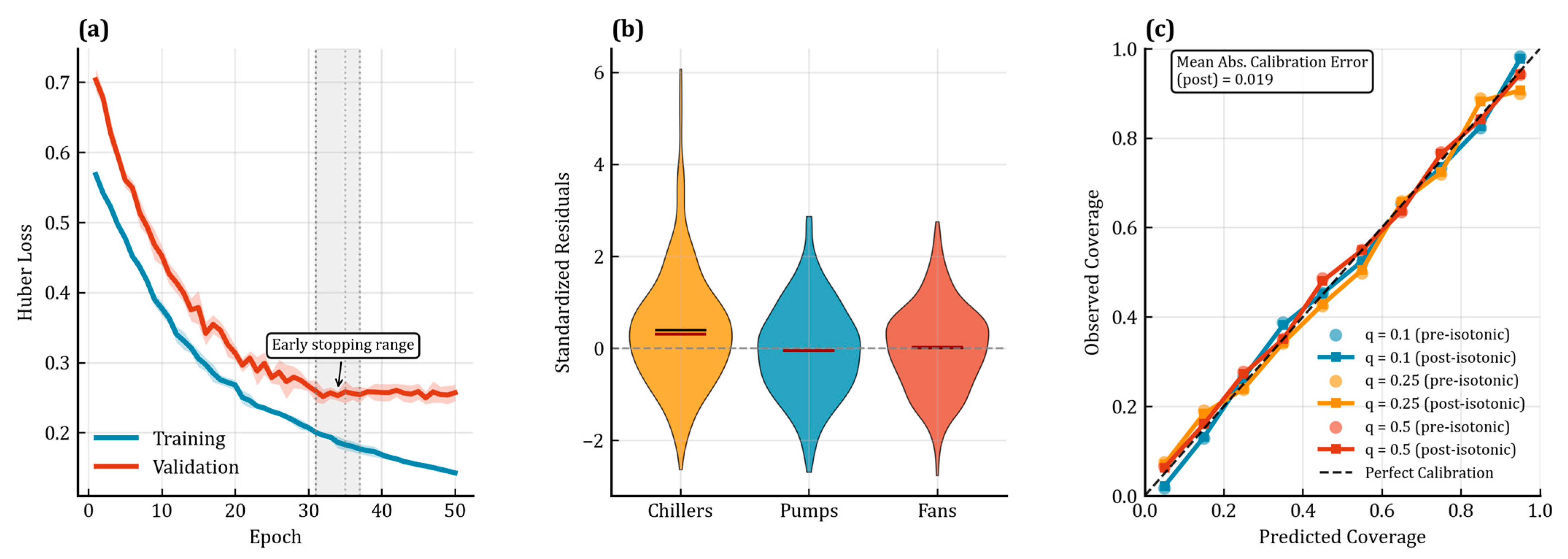 Figure 2. Fitting dynamics, residuals, and calibration. (a) Huber loss over epochs for training and validation across five seeds; early stopping points indicated. (b) Standardized residuals on the test set, faceted by component class. (c) Reliability diagrams for q ∈ 0.1, 0.25, 0.5 with isotonic calibration curves and ideal 1:1 lines.