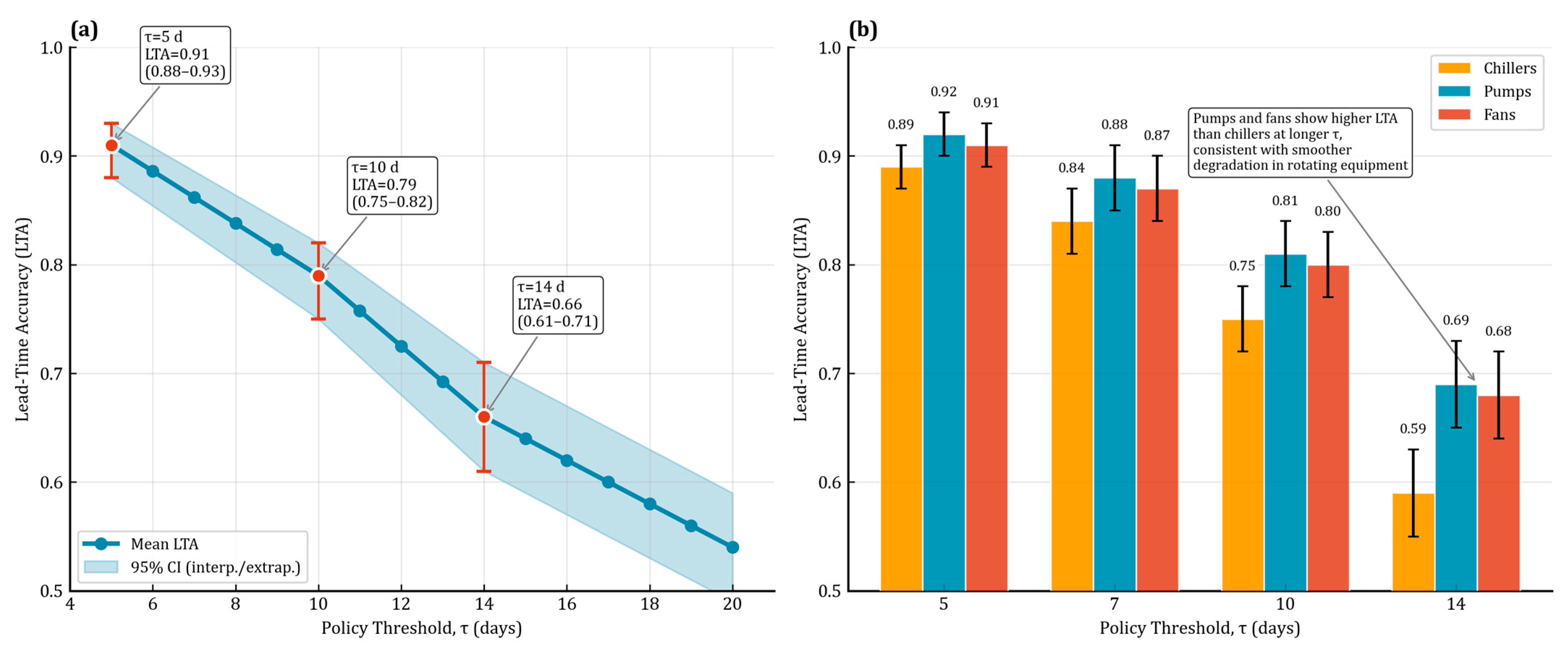 Figure 3. Lead-time characteristics from calibrated quantiles. (a) LTA vs. policy threshold τ at q = 0.25 on the held-out test set. (b) Class-wise LTA at discrete τ values with 95% CIs.