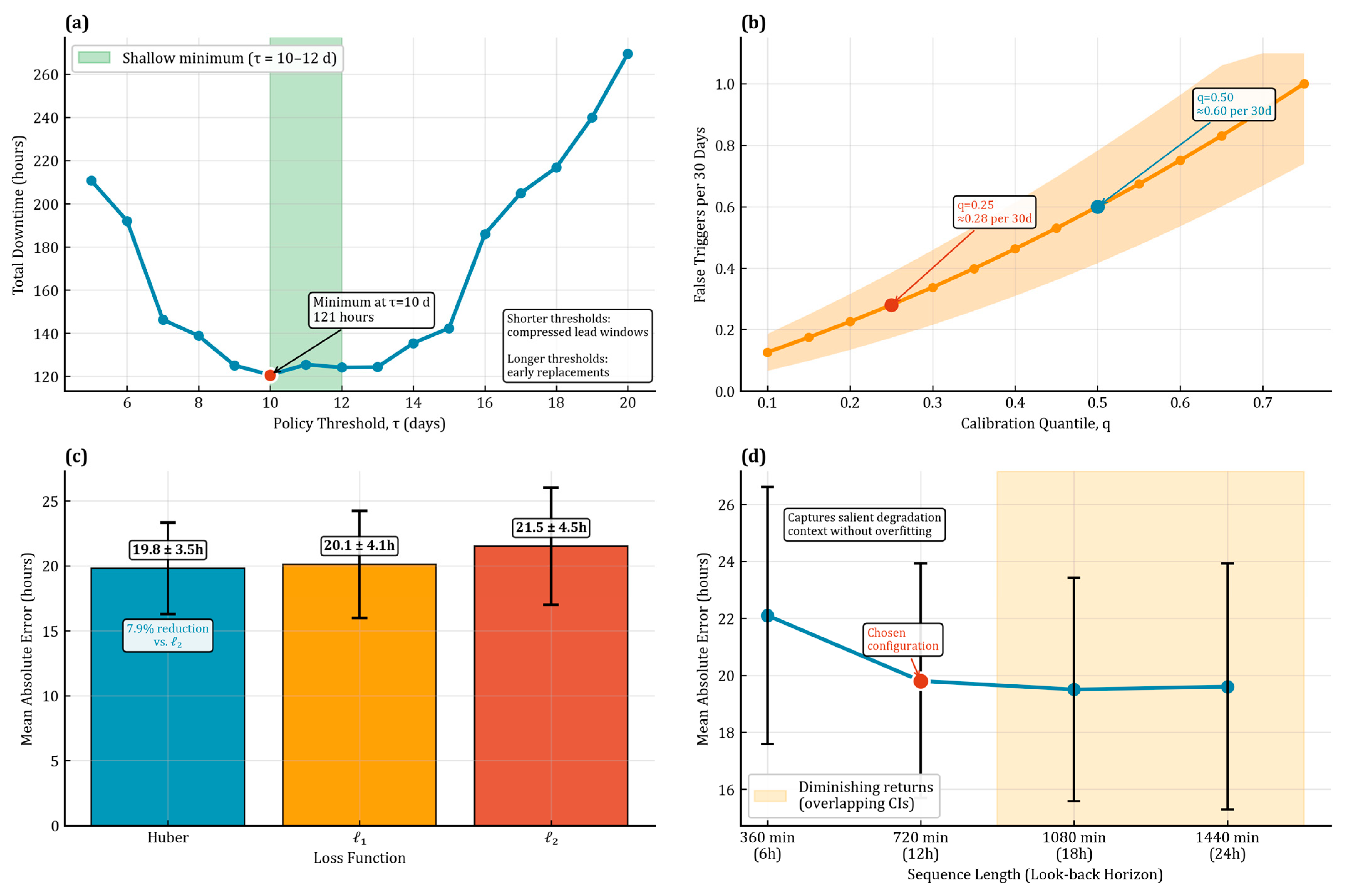 Figure 6. Policy sensitivity and modeling ablations. (a) Total downtime vs. threshold τ . (b) False-trigger incidence per 30 days vs. quantile q at τ = 10 days. (c) MAE by loss function with 95% CIs. (d) MAE vs. sequence length.
