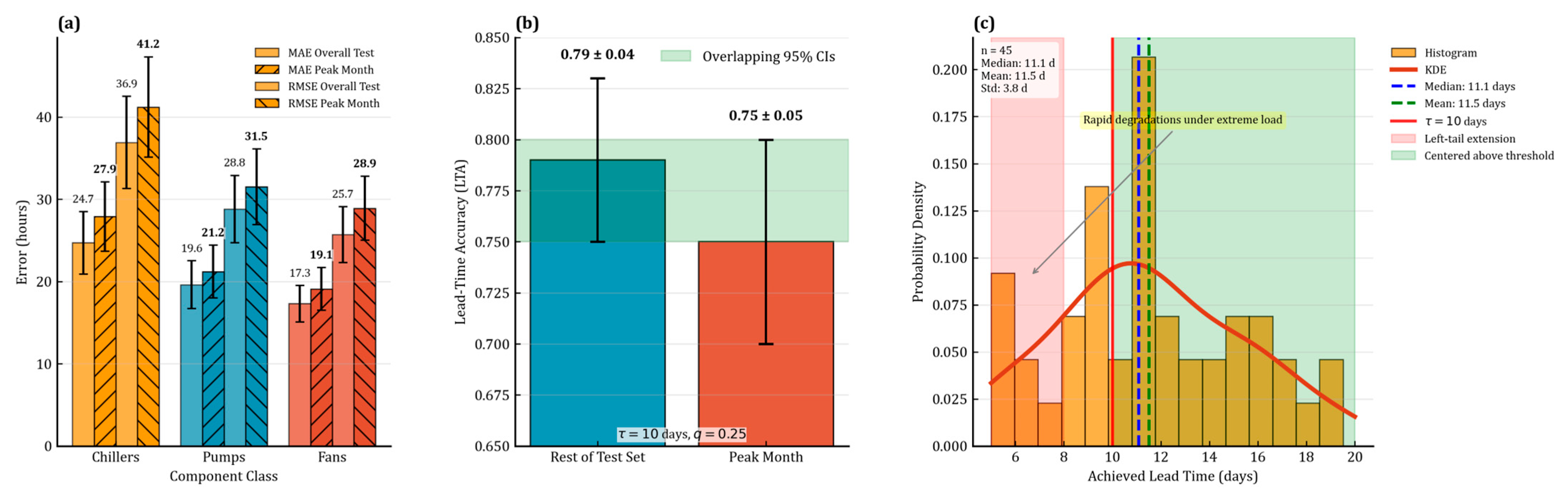 Figure 7. Peak-season robustness on the hold-out month. (a) MAE and RMSE per class during peak month vs. overall test. (b) LTA at τ = 10 days in peak month vs. rest. (c) Achieved lead times for chiller episodes during peak month.
