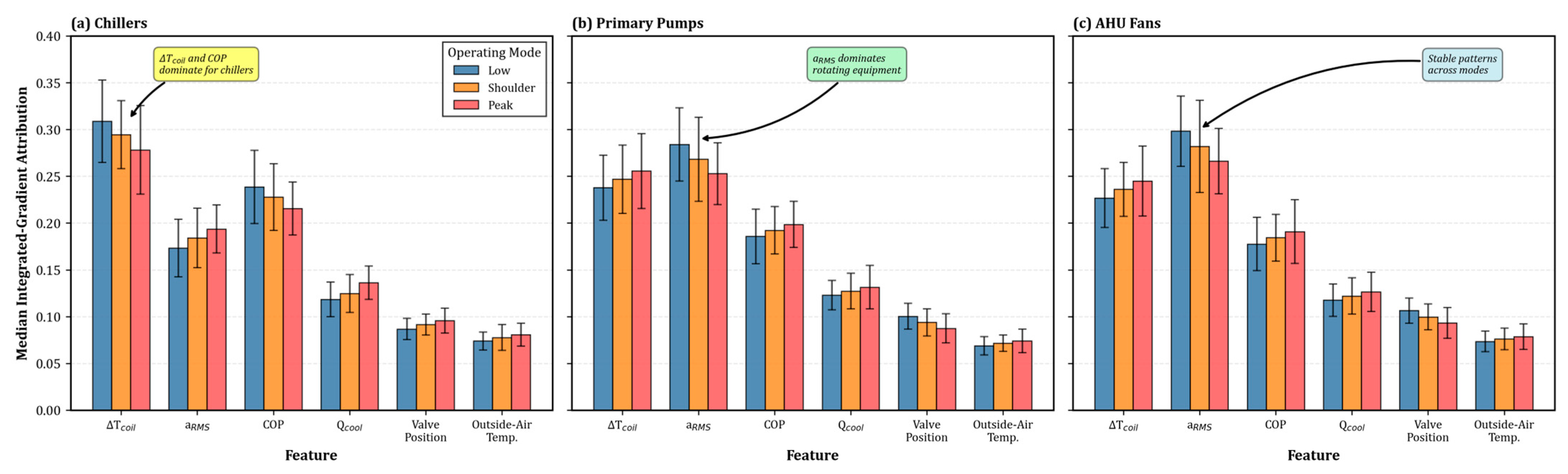 Late trigger (<5 days)42 chillers, 1 pump, 1 fanAbrupt step change in COP due to control override; sudden bearing spallationTemporary manual setpoint clamp before a VIP event; pump cavitation after valve malfunction