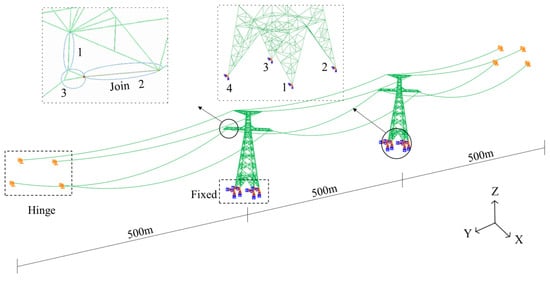 In order to study the effect of additional insulator strings on the structural response of ice-covered transmission lines, this paper selected three cases: (1) intact insulator string; (2) insulator string fracture after the application of ice load; and (3) insulator string fracture before the application of ice load. For each case, eight different conductor ice thicknesses were considered, ranging from 5 mm to 40 mm in 5 mm increments. The ice thickness on the transmission tower and ground wire was set at 10 mm.