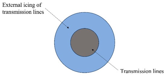 In this study, it is assumed that the ice cover shape of the transmission line is circular [,], with an ice cover density of 0.9 × 103 kg/m3, and the ice cover shape is shown in Figure 3. The calculated ice load is applied in the form of equivalent gravitational acceleration, and the icing density is converted by taking the unit length of the grounding wire. The formula for the equivalent gravitational acceleration (g′) of the ice load can be calculated by Equation (3):