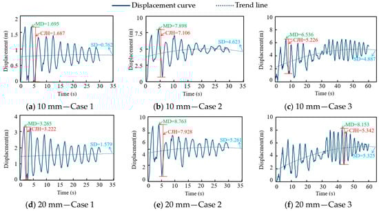 Extracting the displacement response of the wire, the results show that the displacement response curves of the wire under different ice loads are similar under the same case (except for the ice load case corresponding to the cross-arm failure). Figure 4 shows the displacement-time response curves of the conductor under three cases, taking the 10 mm and the 20 mm ice load as examples. It can be seen that after the load is applied, the displacement time curve of the wire exhibits a damping vibration, with the initial vibration amplitude being the largest, gradually decreasing over time, and stabilizing at a constant value. The pattern of Case 1 is most obvious, and its displacement curve is similar to a sine curve with decreasing amplitude. Case 2 has a larger fluctuation amplitude of wire displacement, which is most obvious when the insulator string is just broken. With the passage of time, the wire gradually tends to stabilize. The characteristic of the conductor displacement curve in Case 3 is the combination of Case 1 and Case 2. In order to further analyze the characteristics of the displacement curve of the conductor, the maximum displacement (MD) of the conductor, the conductor jump height of the conductor (CJH), and the stable displacement (SD) are extracted for analysis.