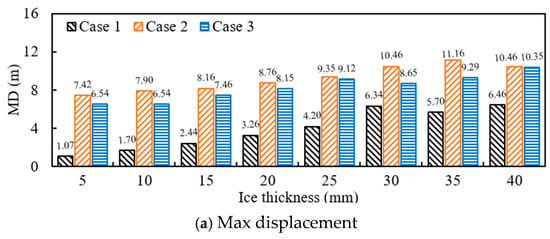 Figure 6 shows the stable displacement curves of the conductor under different ice loads, where the displacement of the conductor is unstable under cross-arm failure and will not be statistically analyzed here. It can be seen that with the increase in ice load, the stable displacement of the conductor gradually increases under the three cases. Among them, the stable displacement of the conductor in Cases 2 and 3 is greater than that in Case 1, and the difference in stable displacement between Cases 2 and 3 is not significant, indicating that the moment of insulator string breaking will not affect the final displacement of the conductor.