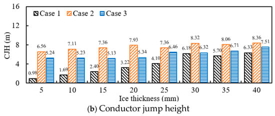 Figure 5 shows the maximum displacement of the conductor and the difference between the maximum adjacent displacement of the conductor under different ice loads for three different cases. It can be seen that with the increase in ice load, the maximum displacement of the conductor and the difference between the maximum displacement of the conductor in the three cases all show an upward trend. Under the same ice load, the maximum displacement and conductor jump height of the conductor in Case 2 are greater than those in Case 3 and Case 1. The difference between Case 2 and Case 3 and Case 1 gradually decreases with the increase in ice load. For example, under a 5 mm ice load, the maximum displacement of the conductor in the three cases is 1.07 m, 7.42 m, and 6.54 m, respectively. The difference between Case 2 and Case 3 and Case 1 is 6.35 m and 5.38 m, respectively. Under a 25 mm ice load, the maximum displacement of the conductor in the three cases is 4.2 m, 9.35 m, and 9.12 m, respectively. The difference between Case 2, Case 3, and Case 1 is 5.15 m and 4.92 m, respectively.