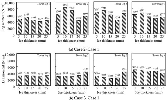The difference in the maximum leg moment between Cases 2/3 and Case 1 was calculated. This difference was then divided by the value from Case 1 to determine the percentage increase. The summarized results are shown in Figure 7. It can be observed that the difference between Case 2 and Case 1 is larger than that between Case 3 and Case 1. As the ice load increases, this difference tends to decrease. The overall percentage increase shows a declining trend, with significant variations among the different measurement members. For example, under a 10 mm ice load, the value at member 1 in Case 2 increased by 122% compared to Case 1, while at member 3, the increase was 67%. The percentage increases at members 1 and 4 are generally higher than those at members 2 and 3.