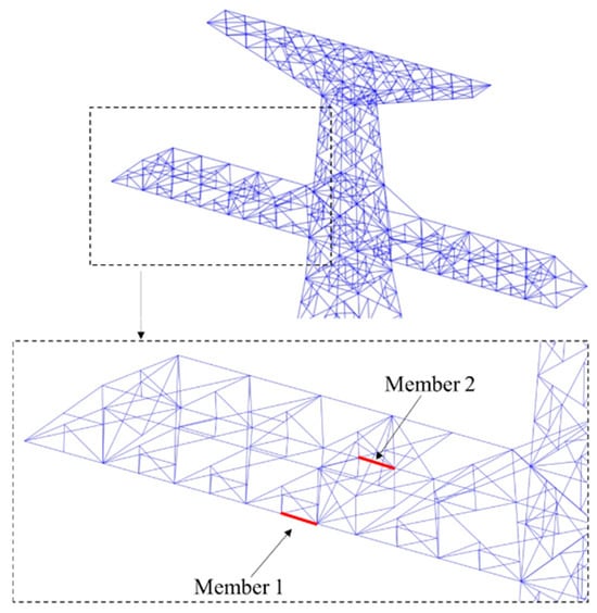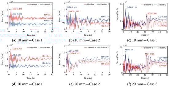 Two members located in the middle of one side of the transmission tower’s cross-arm were selected for stress analysis, with their positions illustrated in Figure 8. The stress response patterns of these two members under different ice loads were found to be similar, except in cases where cross-arm failure occurred. Using the 10 mm and the 20 mm ice load as examples, Figure 9 shows the stress-time curves for both members. It can be observed that the stress curves for both members in Case 1 and Case 2 exhibit a damped vibration, characterized by a gradual decrease in amplitude over time, with the stress eventually approaching a stable value. In Case 3, the stress curve demonstrates a two-stage damped response. A distinct transition occurs at the 30-s mark when an additional load is applied, after which the stress gradually decreases again and stabilizes. The steady-state stress values of the members were extracted across all load cases, with the results summarized in Table 7. The data shows that as the ice load increases, the steady-state stress values for both member 1 and member 2 exhibit an upward trend across all three cases. Furthermore, the steady-state stress of member 1 in Case 3 is lower than in Case 1, whereas for member 2, it is higher than in Case 1.
