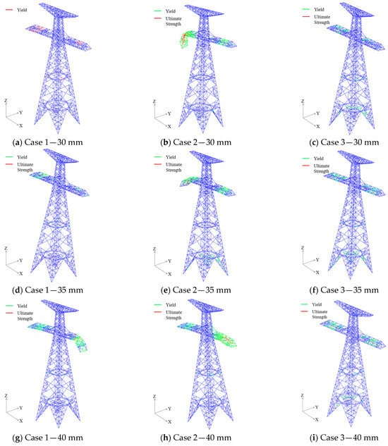 The ice load on the tower was simulated by modifying the material density in the ABAQUS material property definition, while the ice load on the conductors was applied as an equivalent gravity load in the ABAQUS load module. The ABAQUS/Explicit solver was used for the dynamic analysis. Taking the load corresponding to a 10 mm ice thickness on the conductor (hereinafter referred to as the ice load) as an example, the analysis procedure was as follows: (1) At the start of the analysis, the self-weight and ice load were applied to both the tower and the conductor, with the insulator string remaining intact. The analysis was run for 30 s, with the transmission line’s response data recorded every 0.1 s. (2) At the start of the analysis, the self-weight and ice load were applied to the tower and conductor, while the insulator string was modeled as fractured. The analysis duration was 30 s, with response data extracted every 0.1 s. (3) The analysis began by applying the self-weight and ice load to the tower and ground wire, along with the self-weight of the conductor. The insulator string was fractured simultaneously. This initial phase was calculated for 30 s. Subsequently, the ice load was applied to the conductor, and the analysis continued for another 30 s, resulting in a total analysis time of 60 s. Response data were extracted every 0.1 s throughout. The simulation results indicate that as the ice load increased, cross-arm failure occurred in Case 2 at a 30 mm ice load and in Case 1 at a 40 mm ice load.