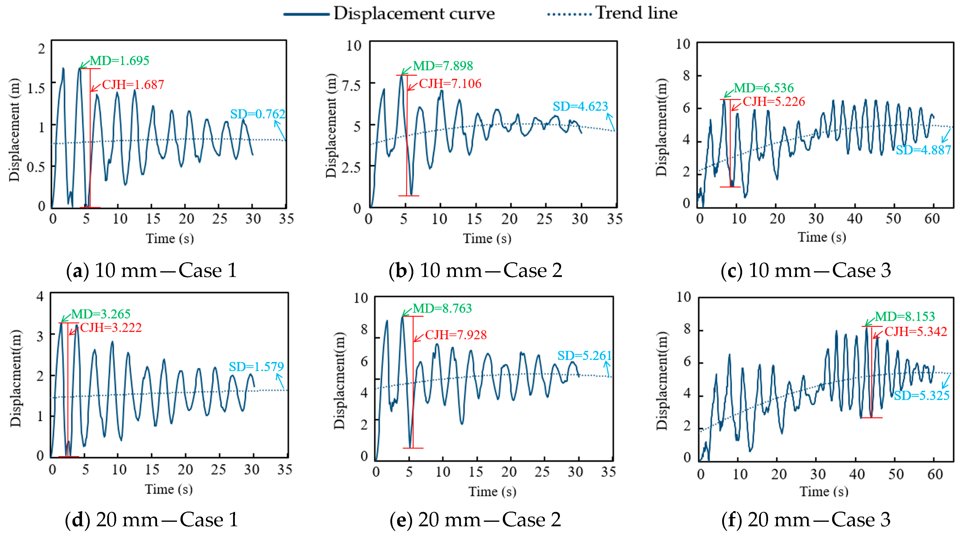 Figure 4 shows the displacement-time response curves of the conductor under three cases, taking the 10 mm and the 20 mm ice load as examples. It can be seen that after the load is applied, the displacement time curve of the wire exhibits a damping vibration, with the initial vibration amplitude being the largest, gradually decreasing over time, and stabilizing at a constant value. The pattern of Case 1 is most obvious, and its displacement curve is similar to a sine curve with decreasing amplitude. Case 2 has a larger fluctuation amplitude of wire displacement, which is most obvious when the insulator string is just broken. With the passage of time, the wire gradually tends to stabilize. The characteristic of the conductor displacement curve in Case 3 is the combination of Case 1 and Case 2. In order to further analyze the characteristics of the displacement curve of the conductor, the maximum displacement (MD) of the conductor, the conductor jump height of the conductor (CJH), and the stable displacement (SD) are extracted for analysis.