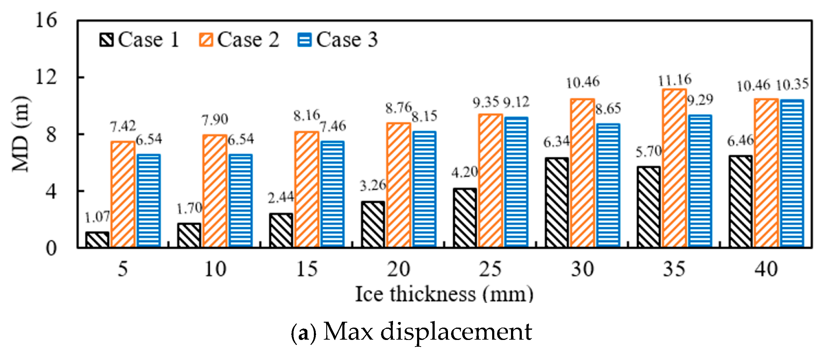 Table 7. The data shows that as the ice load increases, the steady-state stress values for both member 1 and member 2 exhibit an upward trend across all three cases. Furthermore, the steady-state stress of member 1 in Case 3 is lower than in Case 1, whereas for member 2, it is higher than in Case 1.