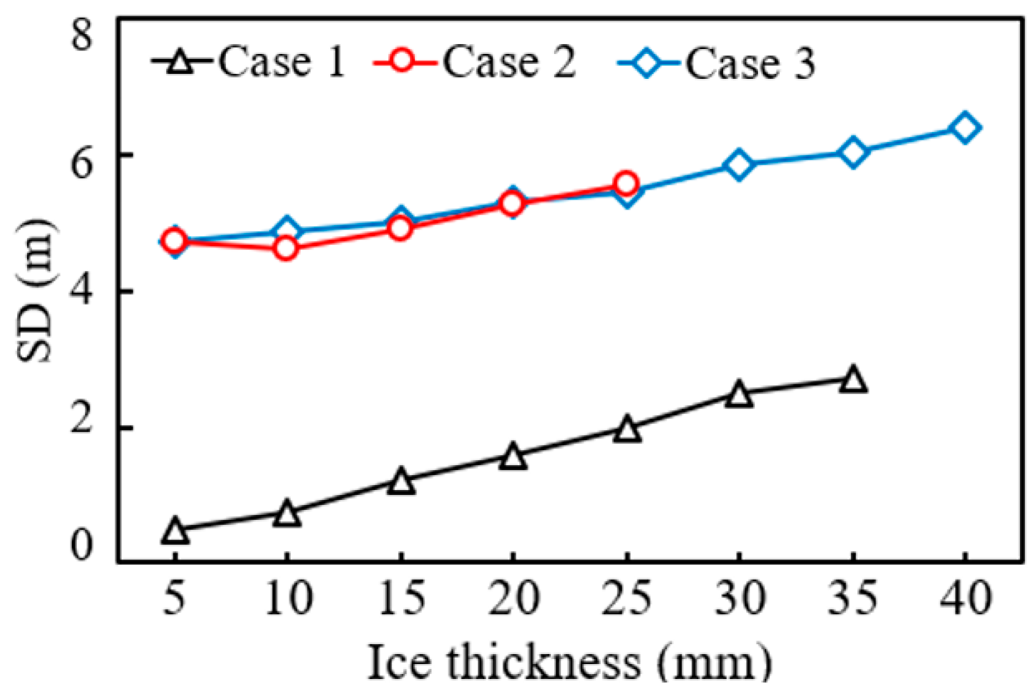 Figure 6 shows the stable displacement curves of the conductor under different ice loads, where the displacement of the conductor is unstable under cross-arm failure and will not be statistically analyzed here. It can be seen that with the increase in ice load, the stable displacement of the conductor gradually increases under the three cases. Among them, the stable displacement of the conductor in Cases 2 and 3 is greater than that in Case 1, and the difference in stable displacement between Cases 2 and 3 is not significant, indicating that the moment of insulator string breaking will not affect the final displacement of the conductor.